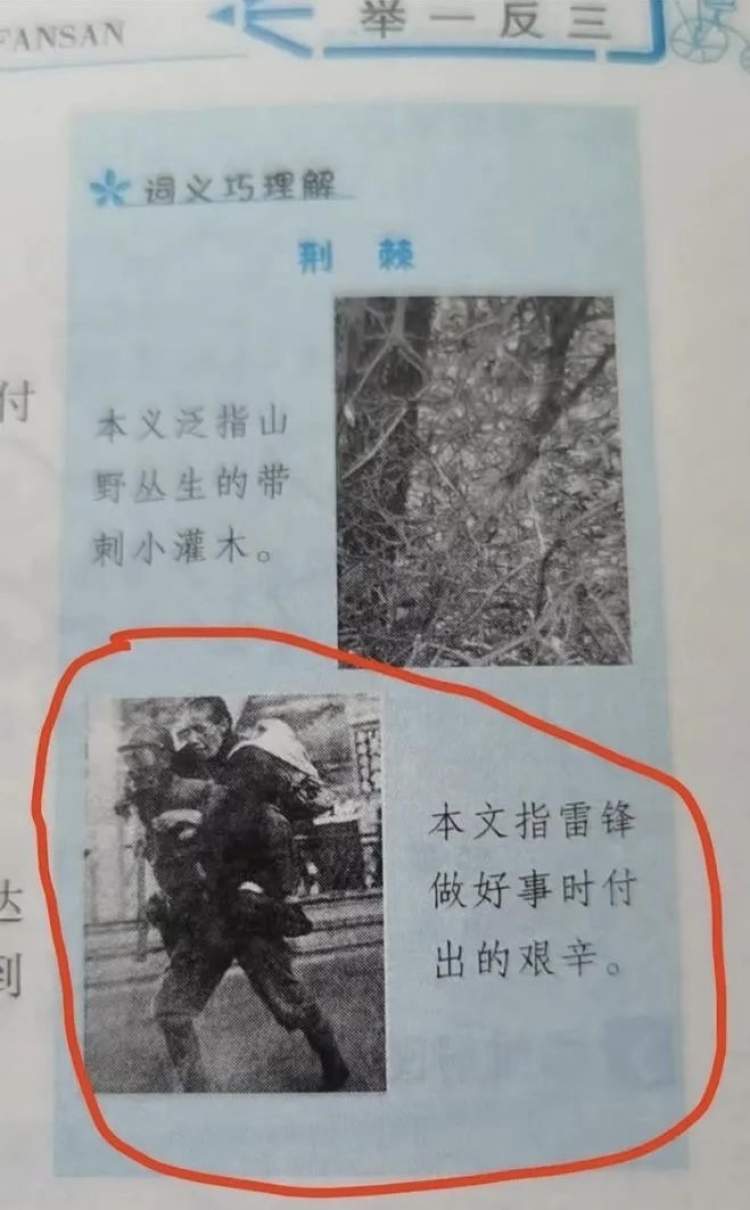 据网友提供图片显示,配图出现在词义巧理解栏中,一幅疑是穿着日军军装的人背着老太的照片,配文为雷锋做好事时付出的艰辛。