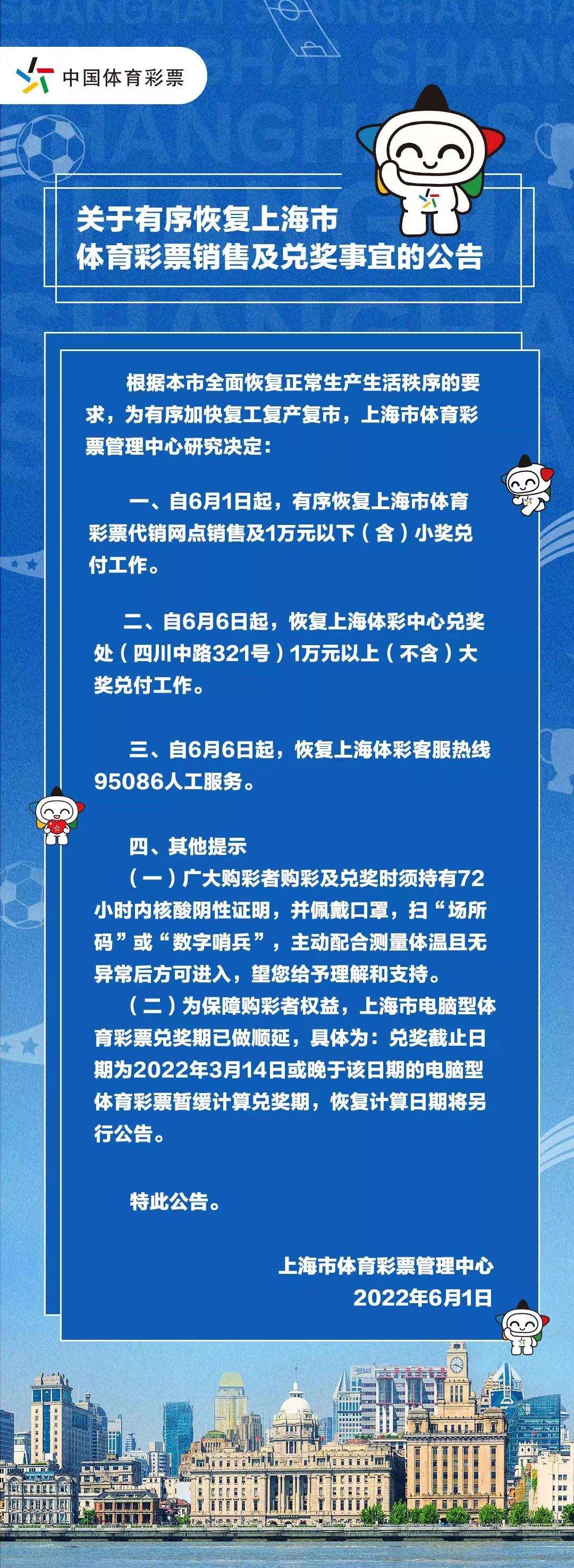 根据本市全面恢复正常生产生活秩序的要求,为有序加快复工复产复市,上海市体育彩票管理中心6月1日发布公告称:即日起,有序恢复上海市体育彩票代销网点销售及1万元以下(含)小奖兑付工作。