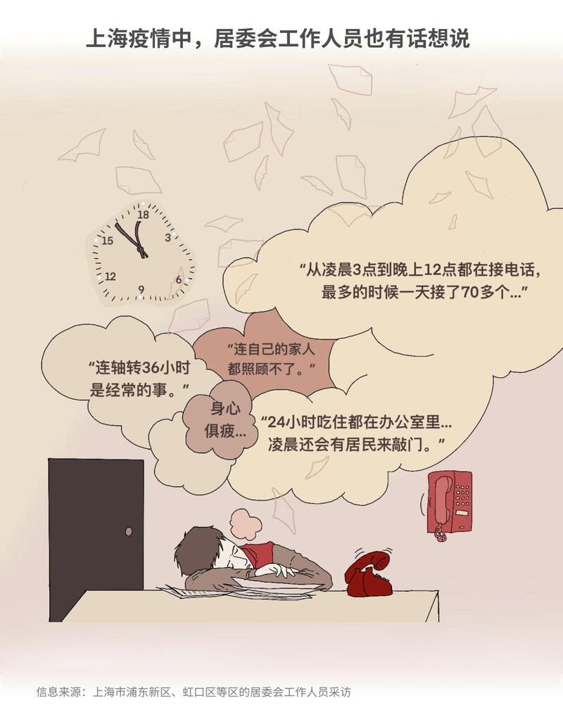 浦东新区居委干部周金表示,从早上8点到深夜11、12点,随时都有可能接到居民的求助电话,“最多的时候,一个人一天接了七八十个电话”。电话一端,是数量繁多的居民诉求,另一端则是疲惫不堪、无力招架的工作人员。