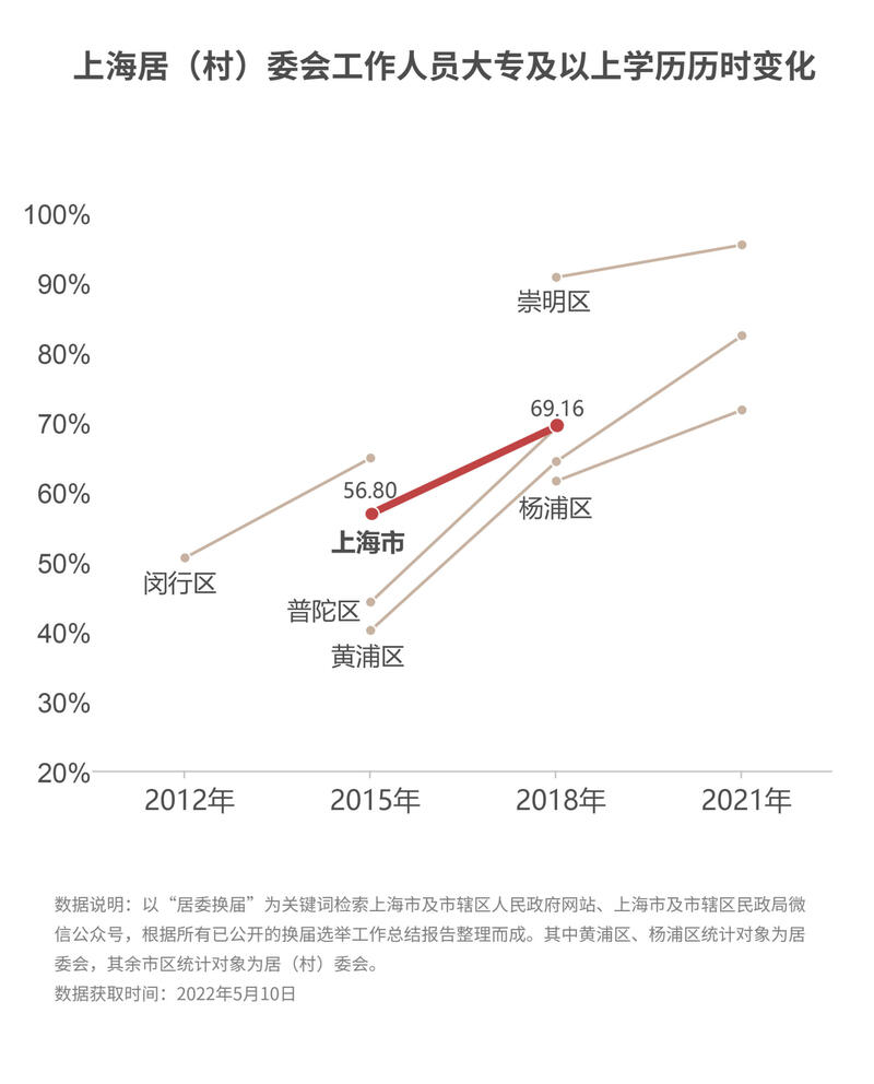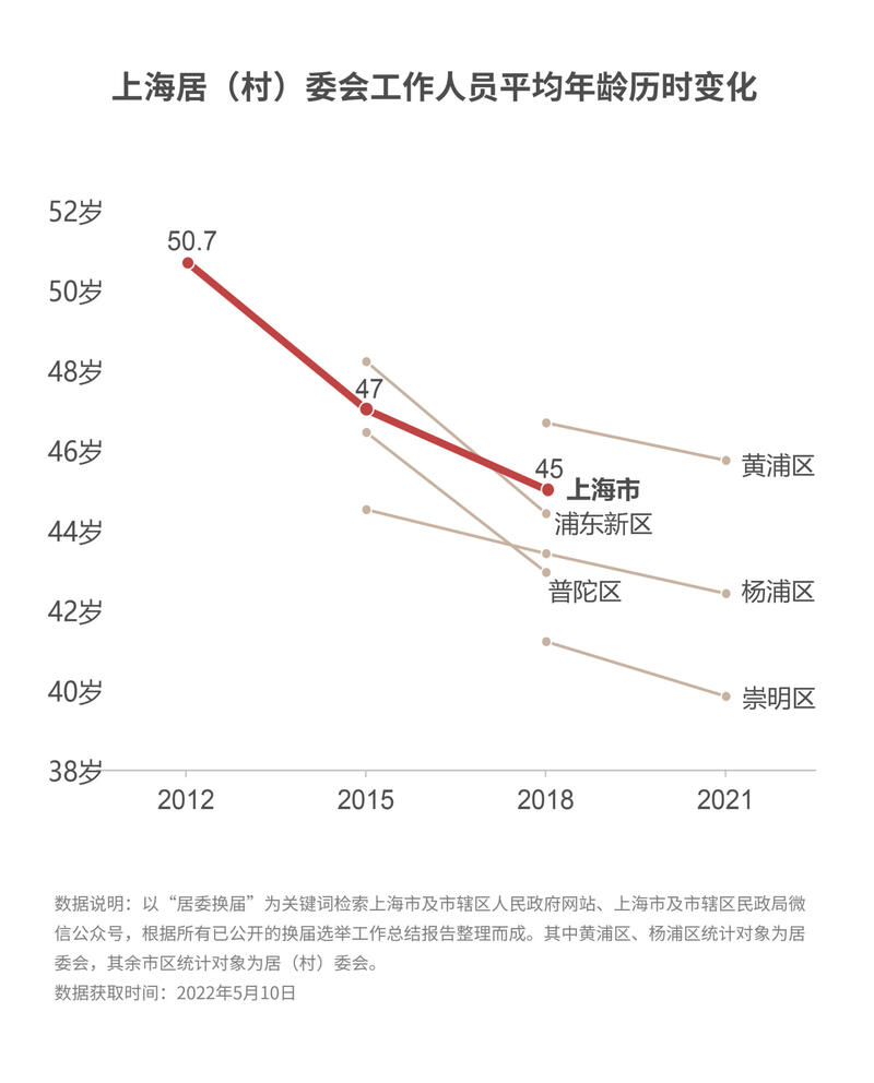 实际上,这个年龄和学历在上海社区基本是平均水平,上海居(村)委会历年换届公开报告显示,尽管目前基层治理队伍人员构成整体上在优化,工作人员平均年龄从2012年的50.7岁降为2018年的45岁,大专及以上学历的比重也增加到69.16%,但相对这次疫情这样复杂的事件,精力和能力上可能都有不尽如人意的地方。