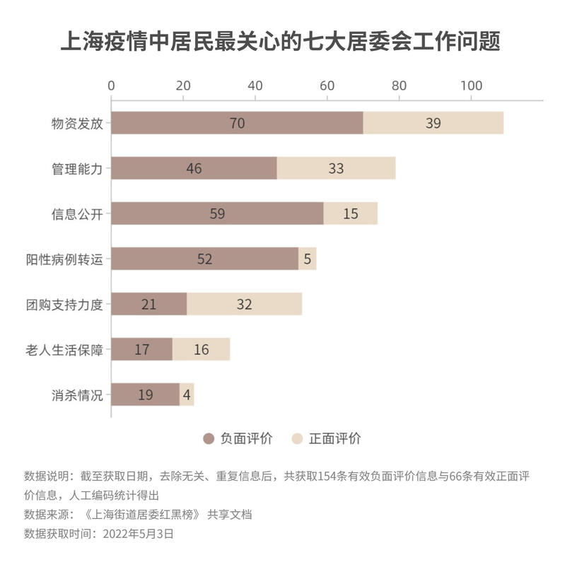 在一份广泛流传的共享文档中,居民们自发为居委评分,分析这些评价可以发现,居民最关注的是居委会在疫情中的物资发放情况、管理能力和信息公开情况。总体来看,网友对上海居委团购支持力度满意度最高,而负面评价最多的则是物资发放和信息公开。