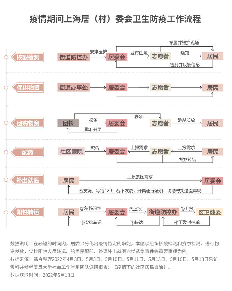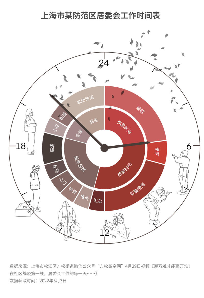 我们根据上海市松江区某防范区小区居委工作人员的工作节奏绘制了时间表,可以看出该小区居委工作人员每日工作时长至少15小时,在风险等级更高的封控区、管控区,居村委工作可能更加繁重。