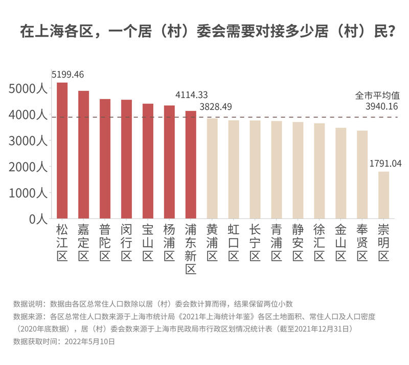 我国《居民委员会组织法》规定,居民委员会一般在100户至700户的范围内设立,由主任、副主任和委员5至9人组成。根据常住人口及居村委会个数的最新数据,可以粗略计算出,上海市一个居(村)委会平均需对接约3940名居民,在松江区这个数字甚至达到了5199。