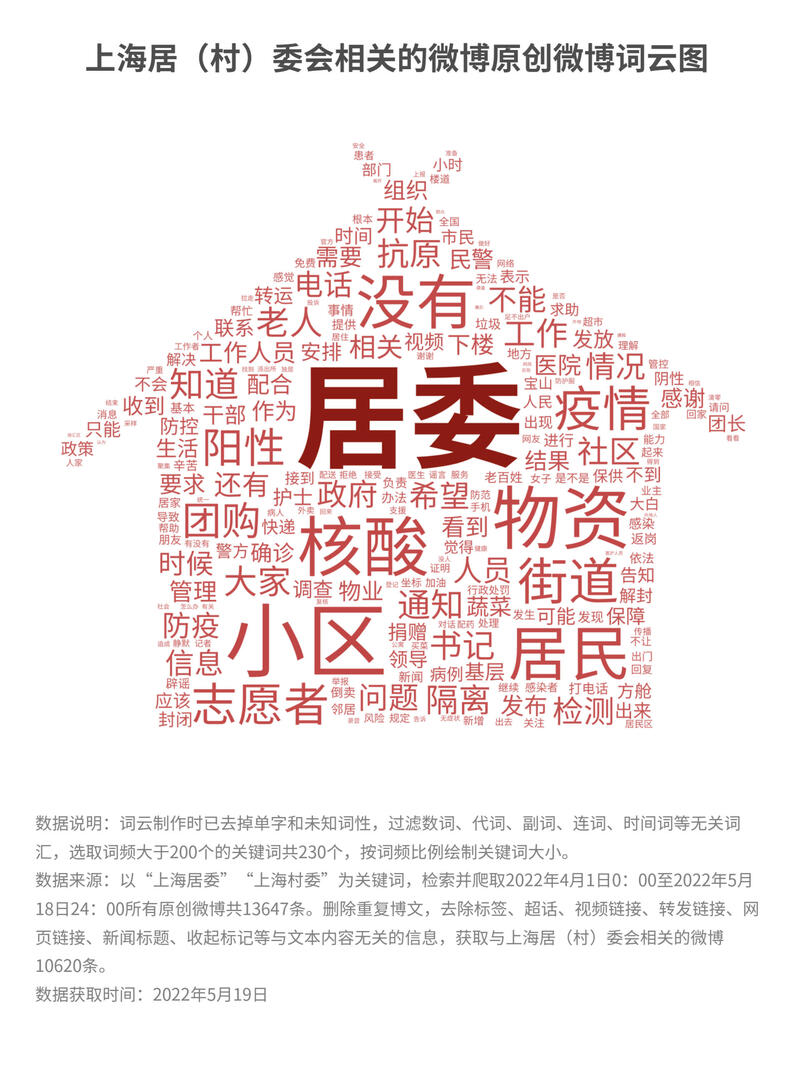 4月1日上海进入全域静止状态至5月18日,讨论“上海居委”或“上海村委”的原创微博已超万条。