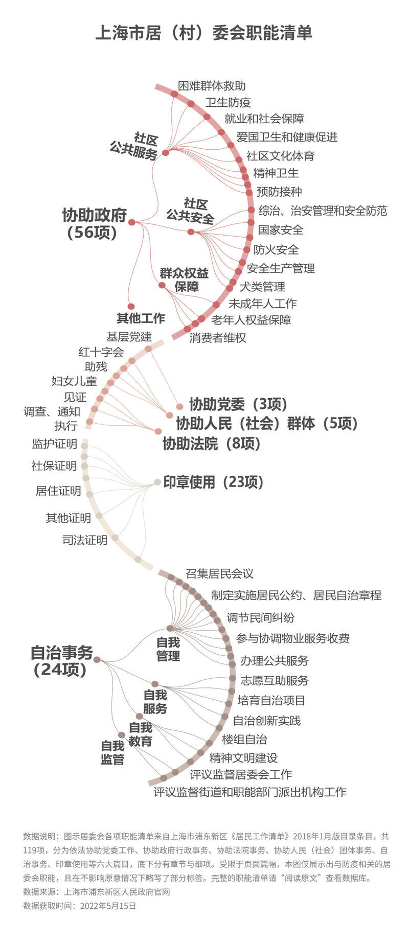 疫情之前,居委的工作就不如一般人想象的那么轻松。上海市浦东新区《居民区工作清单》显示,居委会的日常工作内容多达119项。