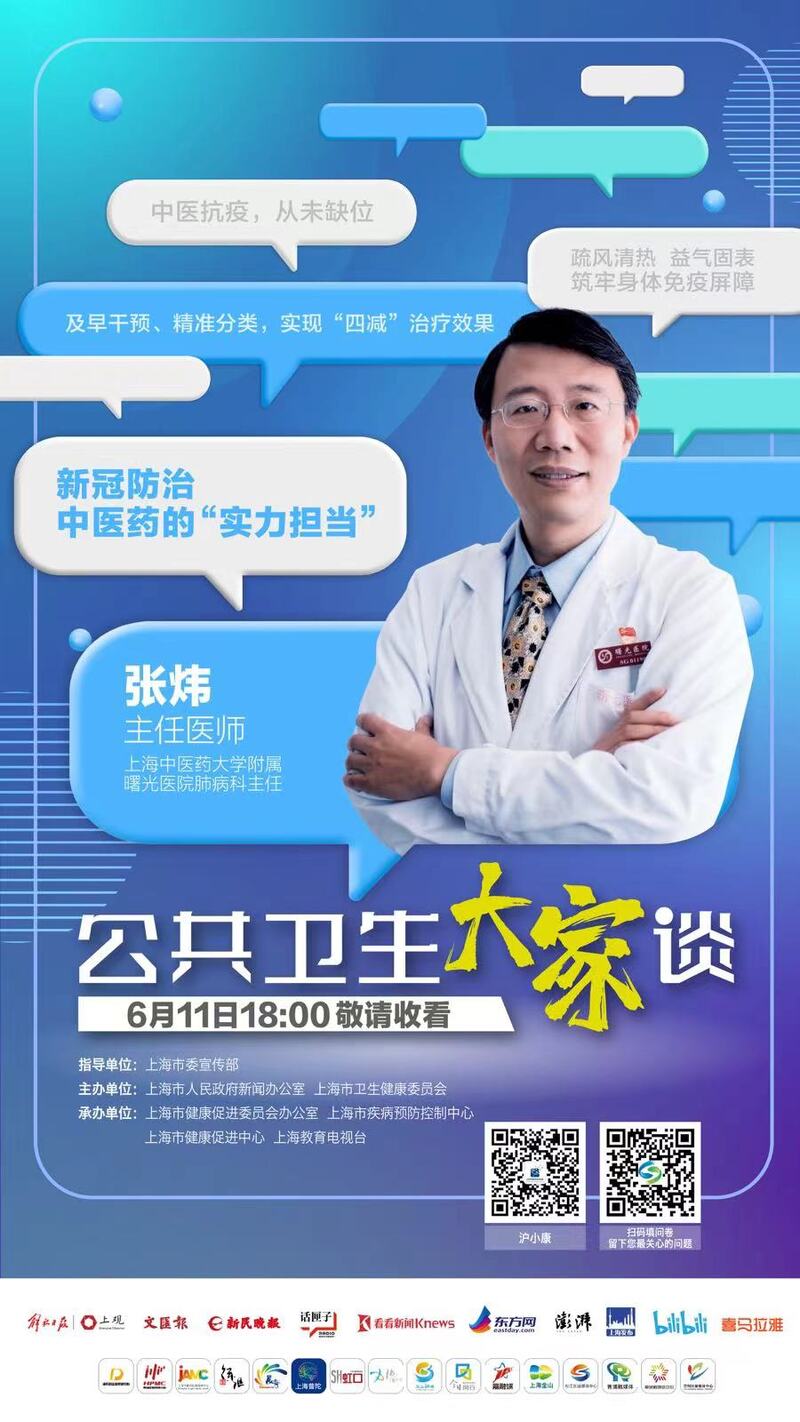 6月11日晚18:00至18:30,“公共卫生大家谈”系列讲座第十一期,特邀上海中医药大学附属曙光医院肺病科主任、上海市中医药新冠肺炎防治专家组成员张炜主任医师,带我们了解新冠防治中的“中医力量”。