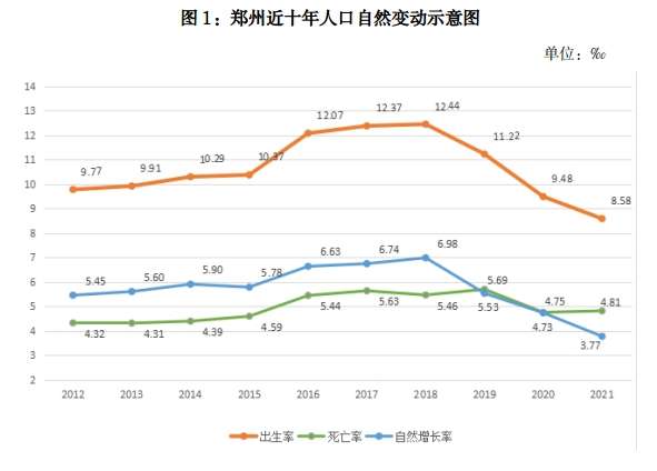 报告显示,受双独、单独及全面二孩政策的影响,郑州市近10年来人口自然增长率曾在一段时期内保持了上升的趋势,但自2019年以来,开始走低,但仍好于全国、全省平均水平。虽然有2021年开放三孩的政策支持,但三孩开放时间较晚,受各种因素的影响,其效应暂未显现。