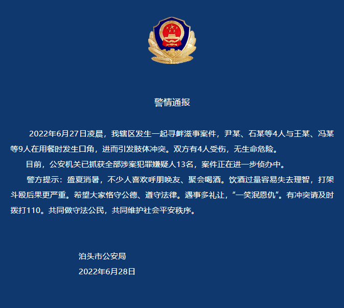 河北泊头市公安局微信公众号6月28日发布警情通报,6月27日凌晨,当地发生一起寻衅滋事案件,尹某、石某等4人与王某、冯某等9人在用餐时发生口角,进而引发肢体冲突。双方有4人受伤,无生命危险。