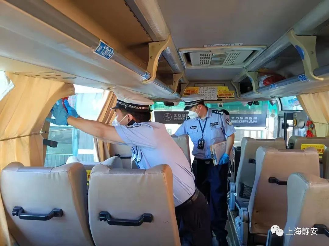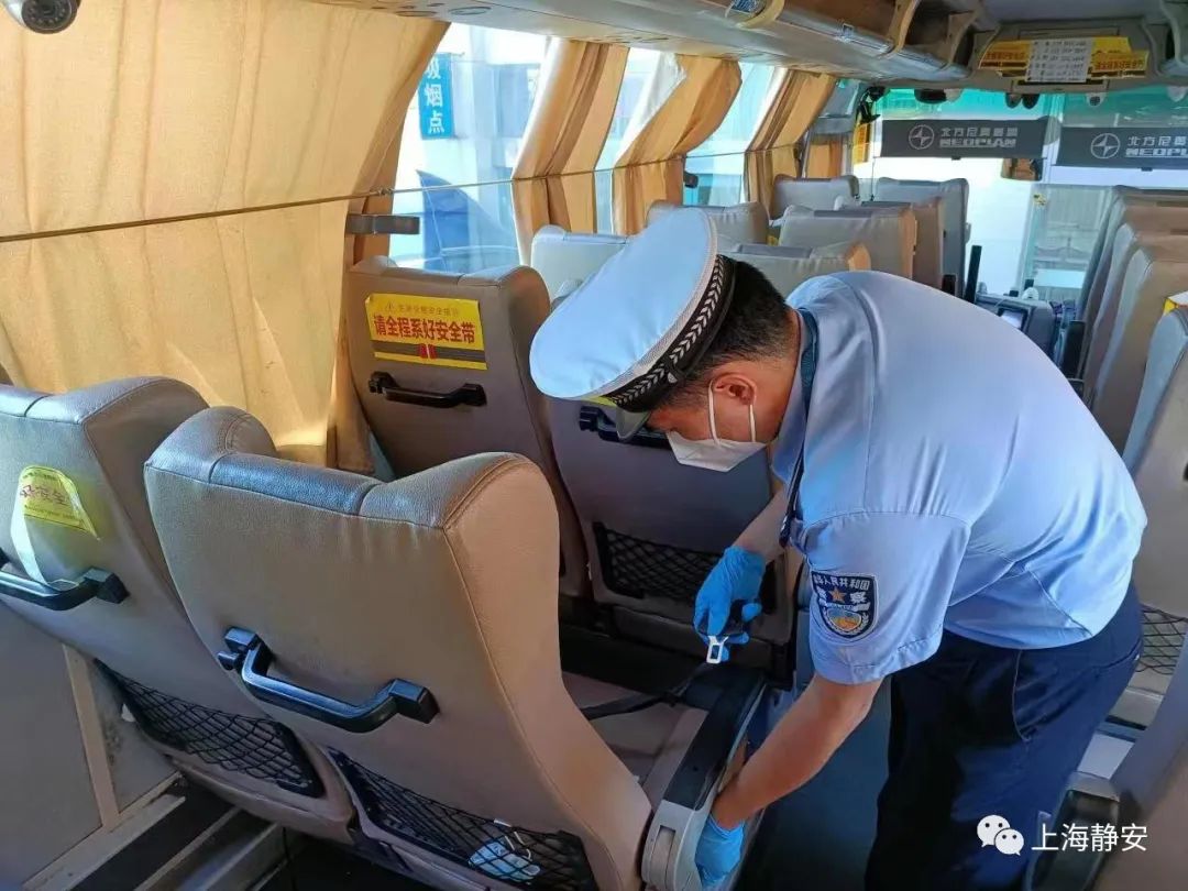 上午9点半,在位于中山北路1015号的沪太站,静安交警支队民警对客运大巴开展安全检查。