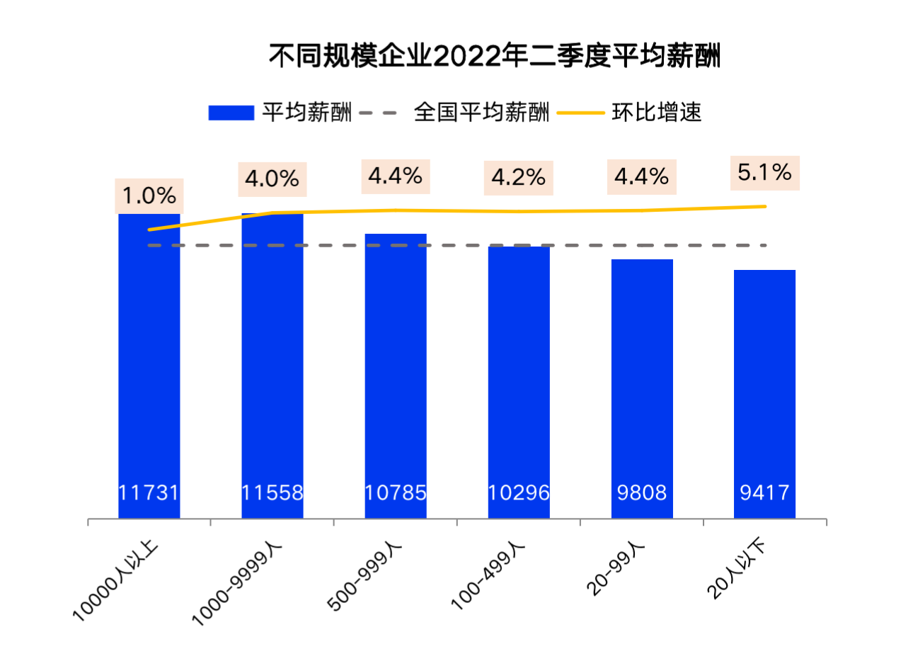 受纾困政策和疫情影响,二季度虽然依然呈现企业规模越大招聘薪酬越高的趋势,但从薪酬变化看,二季度小微企业涨幅更高。根据报告,在持续有力的纾困政策下,小微企业招聘开始有所恢复。同时,在当前大环境下,小微企业更加倾向于招聘具备经验和技能的人才,因此平均工资升高。20-99人、20人以下企业薪资分别环比增长4.4%、5.1%。