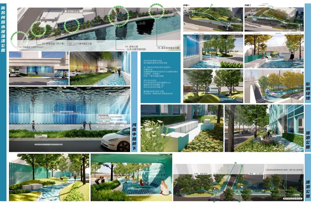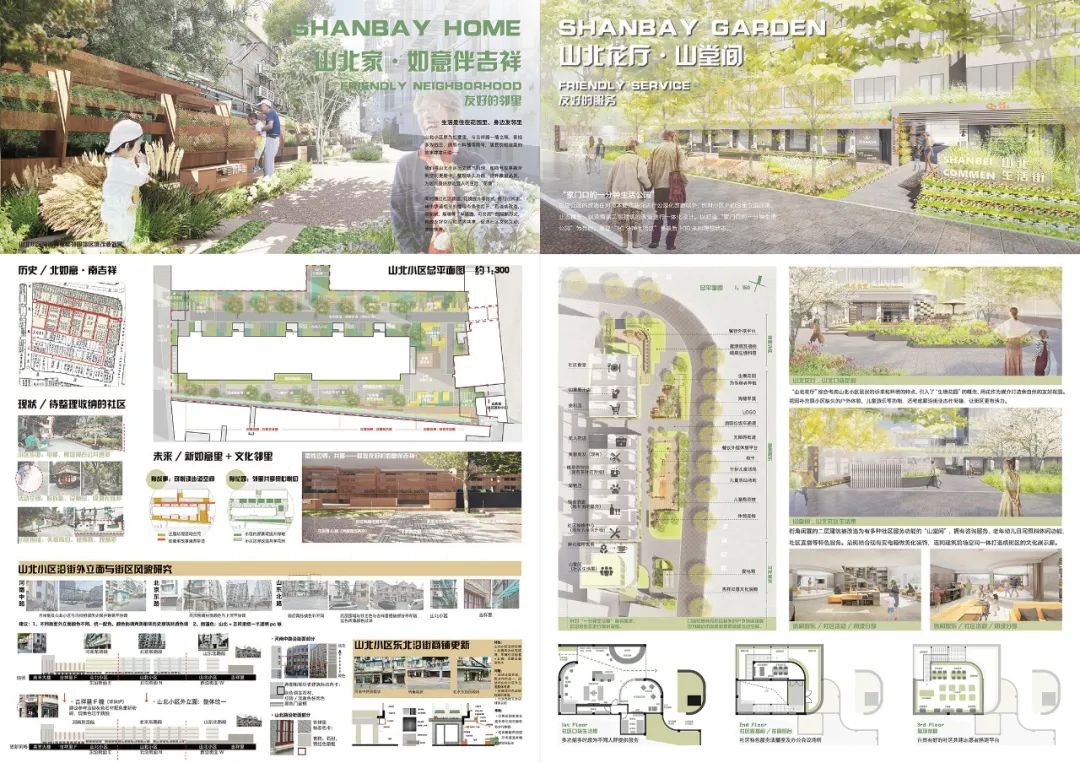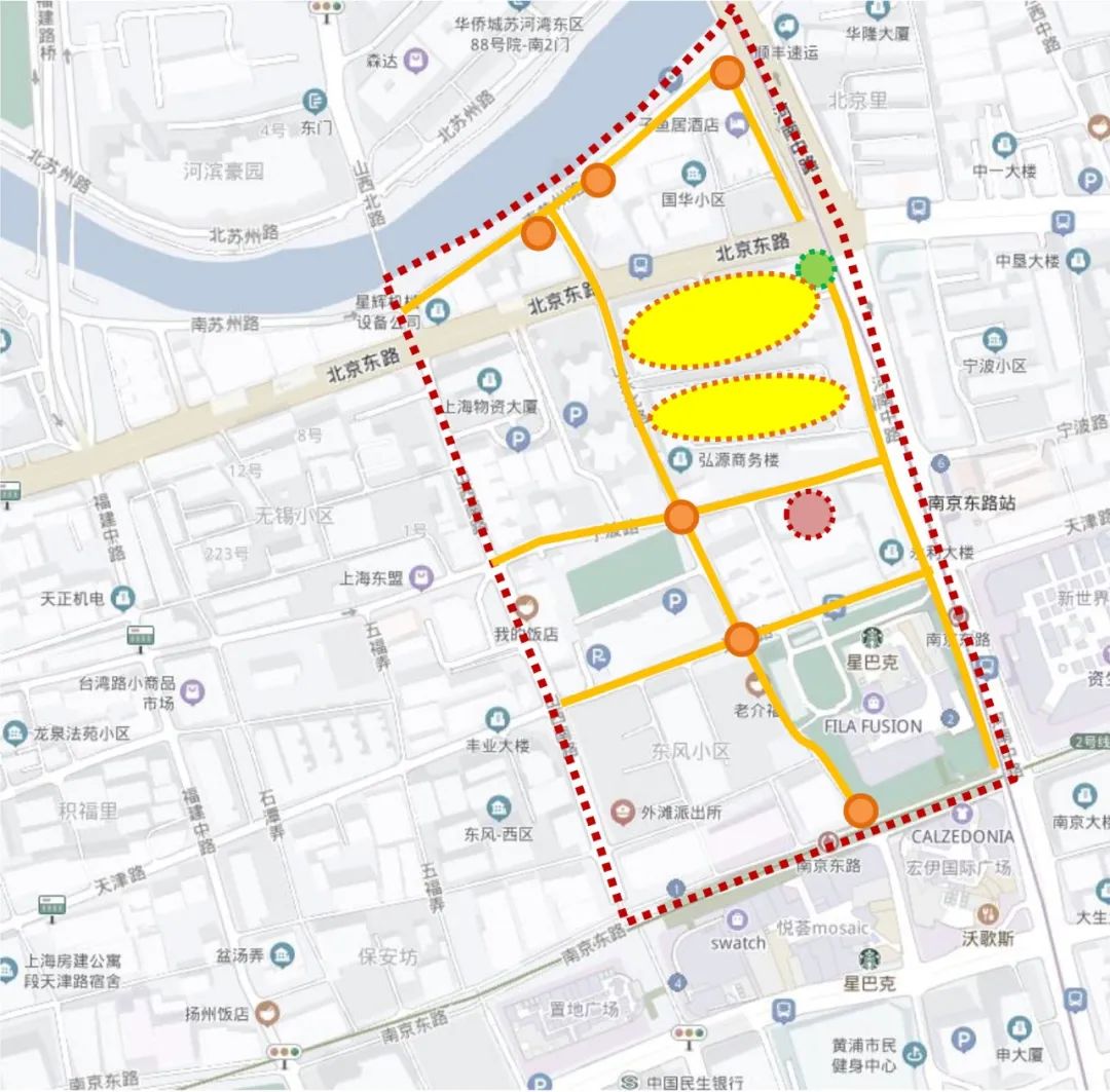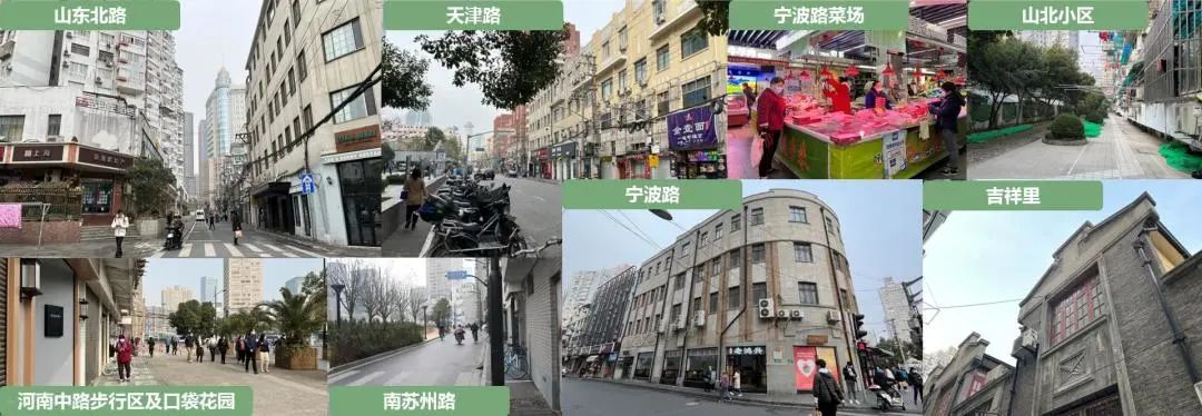 山北街区的重要节点共有9个,设计方案包括3个必做项(山东北路及南延伸公共通道、南苏州路南侧步行区和山北小区),以及至少1个选做项(河南中路西侧步行区、天津路、宁波路、吉祥里、口袋花园、宁波路菜场)。