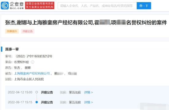 网易娱乐7月28日报道 据企查查APP显示,近日,张杰、谢娜与上海雅銮房产经纪有限公司、霍某某、项某某名誉权纠纷案将于2022年8月17日在上海市金山区人民法院开庭。