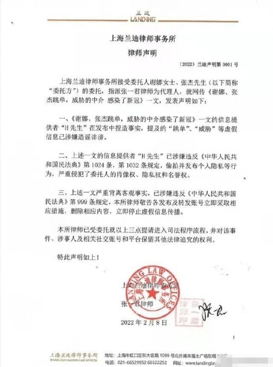 随后,谢娜、张杰方发律师函辟谣,称霍某某捏造事实,提及的“跳单”“威胁”等虚假信息已涉嫌造谣诽谤。