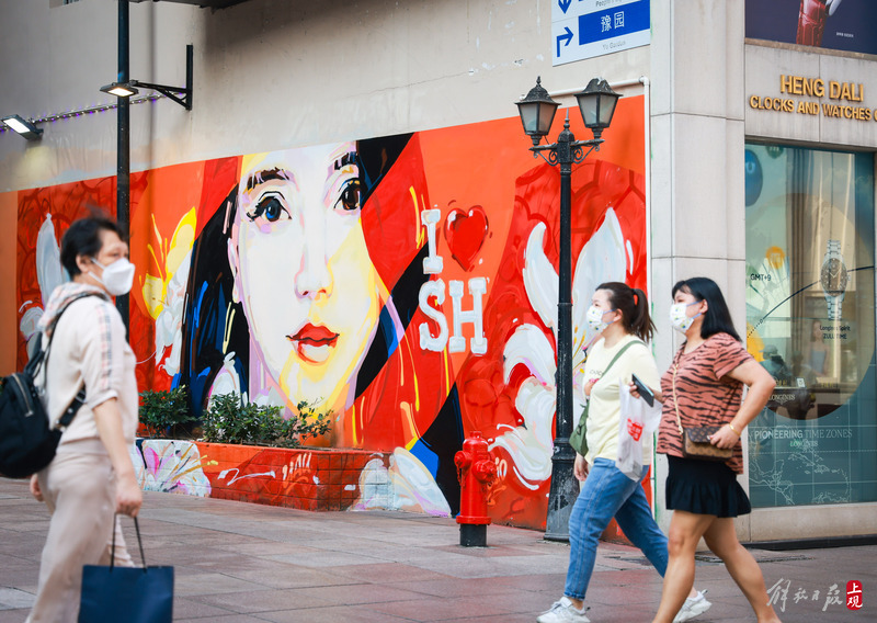 南京路步行街上新增了一处画着“玉兰花”和“我爱上海”等内容的涂鸦。