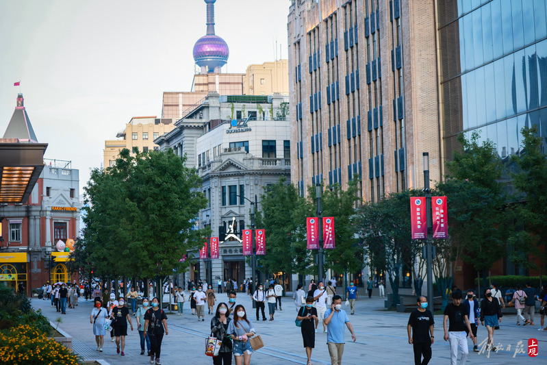 傍晚时分,人们在南京路步行街上休闲散步。