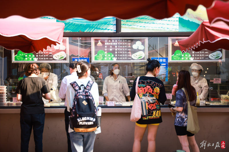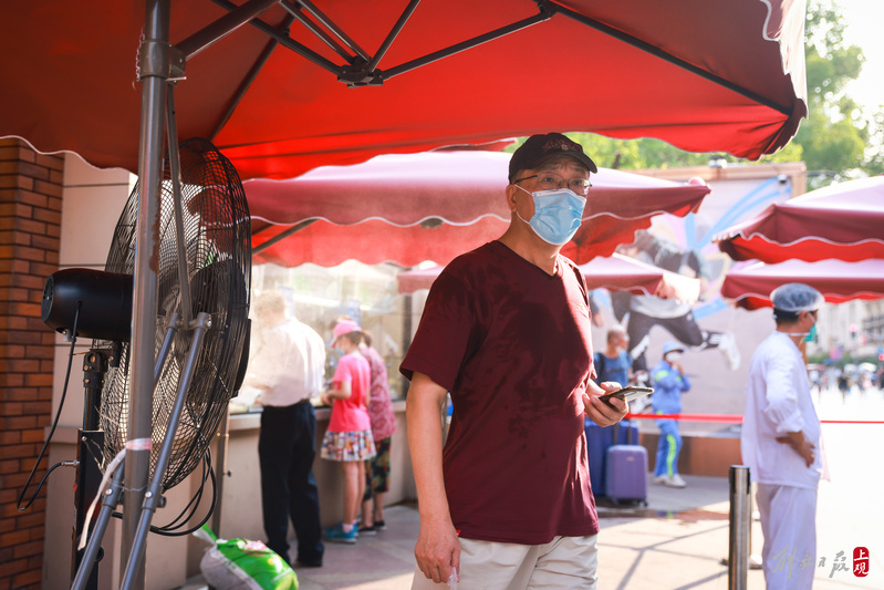 南京路步行街上的沈大成、老大房、三阳南货店世纪广场临时门店外摆好了遮阳伞,多台喷雾电风扇开启,为途经此处的人们带来高温下的清凉。