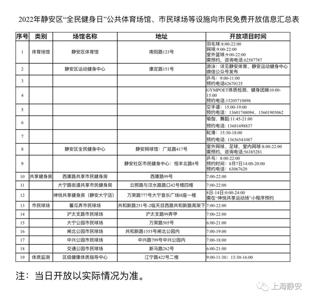 8月8日全民健身日当天,静安区符合条件的公共体育场馆和公共体育场地设施免费向公众开放,同时鼓励部分有条件的社会经营性体育场馆向市民免费开放。