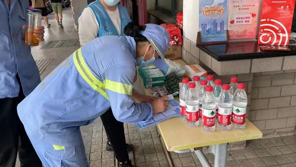 徐家汇街道新时代文明实践分中心、徐家汇社区志愿服务中心联合徐家汇社区文化活动中心,盘活现有的物资,持续不断,提供矿泉水等日常饮用水,龙虎人丹、风油精、蚊不叮等防暑降温用品,以及口罩、免洗洗手液和消毒液等防疫必需品。