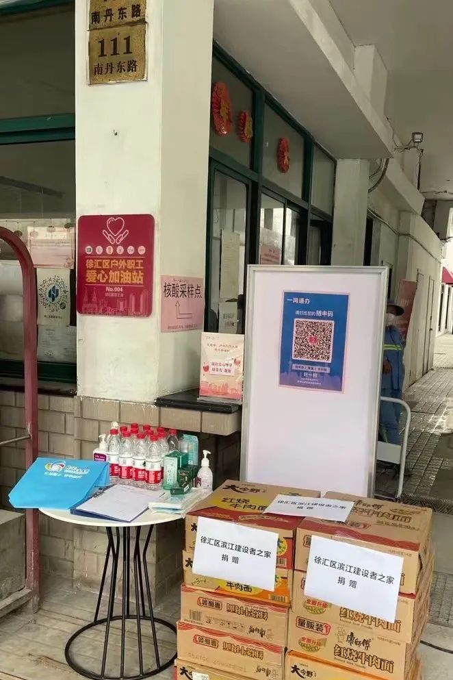 在站点选址上,结合社区疫情防控,将爱心加油站设置在户外显著位置,即南丹东路109号门口,这样不仅大大减少了社会面交叉感染的风险,更是有利于地理位置靠近徐家汇商圈的户外工作者方便找寻、领取爱心物资。