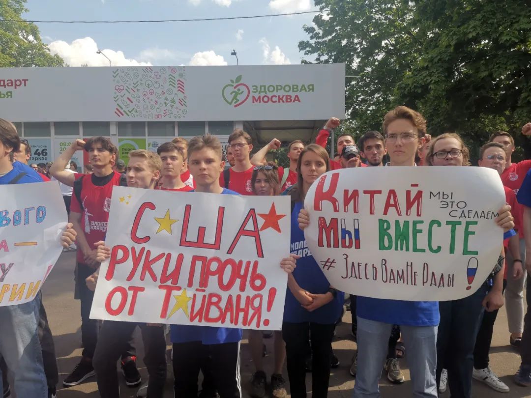 8月4日中午时分,一浪高过一浪声援中国、谴责美国的口号声响彻中国驻俄罗斯大使馆门前。来自俄罗斯最大青年组织“青年近卫军”的近400名青年学生自发聚集于此,以实际行动强烈谴责美国众议院议长佩洛西近期窜访台湾。