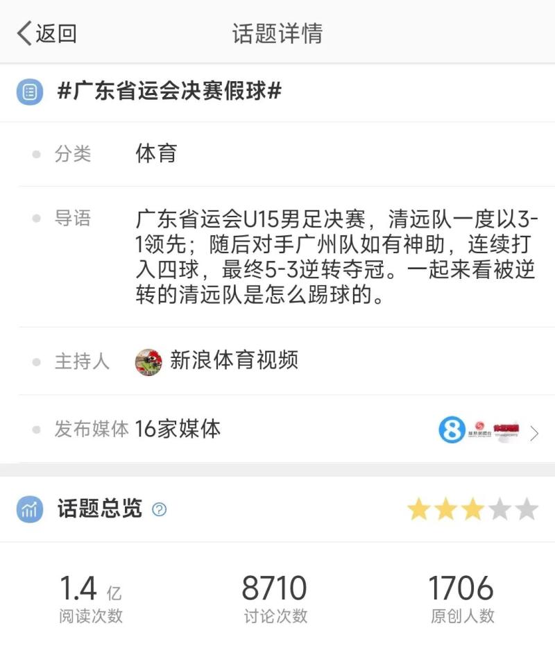 8日,一则#广东省运会决赛假球#的话题词条,在很长时间占据微博热搜高位。截至发稿时,此话题阅读量突破1.4亿,近9000人次参与讨论。
