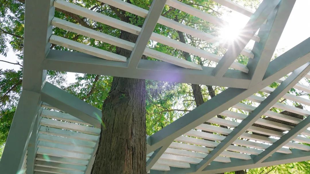 在环城河(外圈)东门吊桥南侧绿地区域“落英湾”,尽管天气炎热,施工人员仍在加紧建设中。园内的便民设施风雨廊架已经基本搭建完毕,纯白色的廊架与乔木融为一体,增强植物空间观赏性的同时,也为公园增添一处避雨和林下休憩的场所。