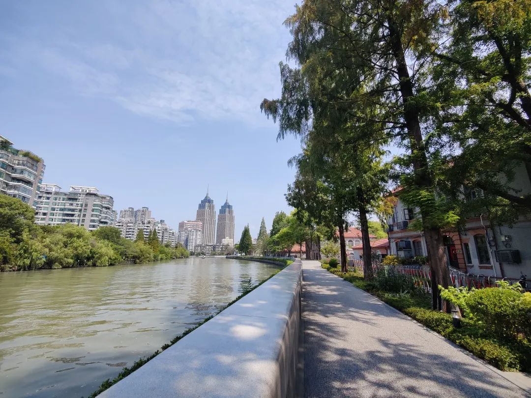 区建管委介绍,华政段沿河岸线改造提升工程对原本狭窄逼仄、景观单一、缺少公共服务设施的滨河步道进行全面梳理与重新布置,将原有单一的“人行步道+植物绿化”的景观形式改造成为“校园景观+共享空间+滨河步廊”的全新模式。