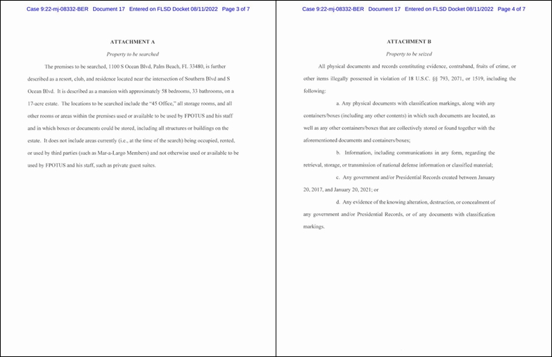 《纽约时报》指出,这份搜查令似乎给予了FBI特工的搜查相当大的自由度,允许他们进入“45号办公室”以及可能用于储存文件的“所有储藏室和所有其他房间或区域”。美国《新闻周刊》10日曾援引美政府高级官员报道称,FBI此次行动主要基于一名线人的消息,他认定特朗普藏有机密文件,还能定位文件位置 。