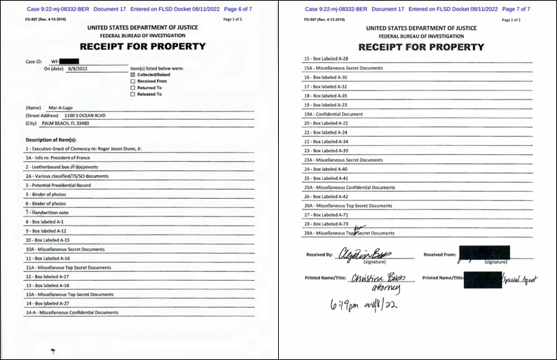 此外,根据财产收据清单,FBI在对于海湖庄园的搜查中共查获了11套文件,其中4套被列为“其他绝密文件”(Miscellaneous Top Secret Documents),1套被列为“各种机密/TS/SCI”(Various classified/TS/SCI)的文件。