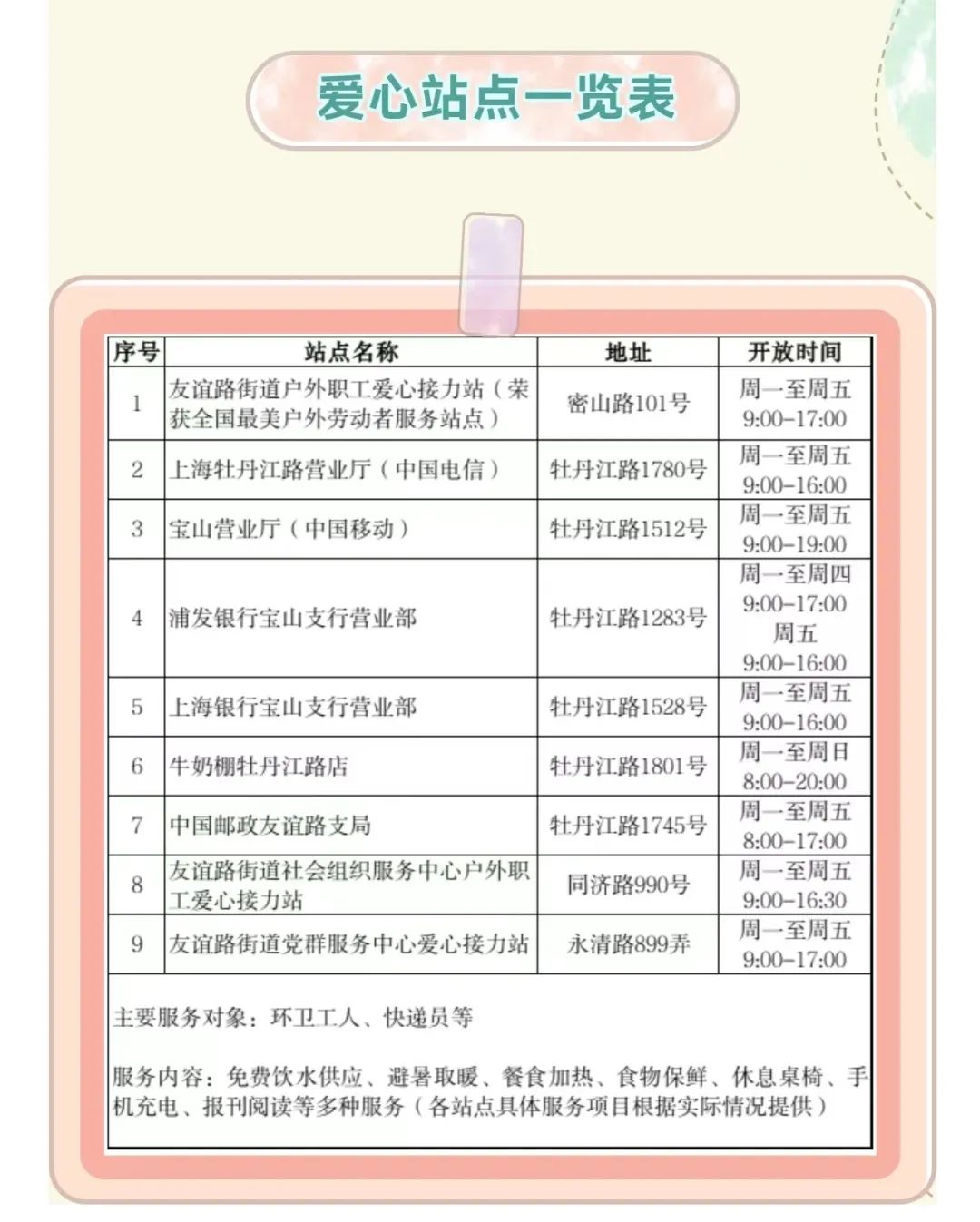 此外,街道辖区内的其他站点,也欢迎户外职工光临。