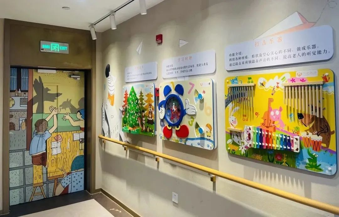 万宏悦馨养老院的认知症照护专区结合了非药物干预的康复理念,在长者居住的楼层打造了游戏康复类、感统干预康复类、机能康复类等不同主题的活动空间,还在功能区设置了综合评估室、五感体验室以及亲情接待室,通过融合式单元管理模式,模拟家庭环境、绿植疗法、音乐疗法、艺术疗法、怀旧疗法等与药物相结合,针对认知症长者身心特点和照护需求,延缓认知症发展进程,改善长者抑郁、焦虑等情绪,让患有认知症长者享受有意义的生活和有温度的养老。