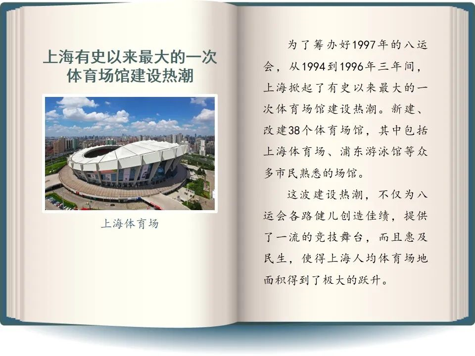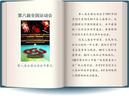 1997年八运会在上海举办,这是20世纪我国规模最大、水平最高的体育盛会。对于上海来说,也是把各个机关、系统的人,还有千千万万市民都动员起来的城市大事。我觉得像我这个年代的上海人,对于八运会肯定会留有印象。