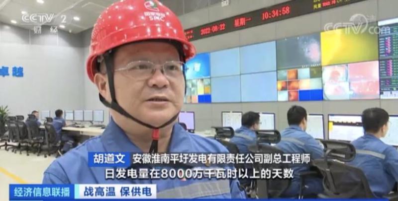 安徽淮南平圩发电有限责任公司副总工程师 胡道文:迎峰度夏期间日发电量在8000万千瓦时以上的天数达到44天,9000万千瓦时以上达9天,均创造建厂以来最高纪录。