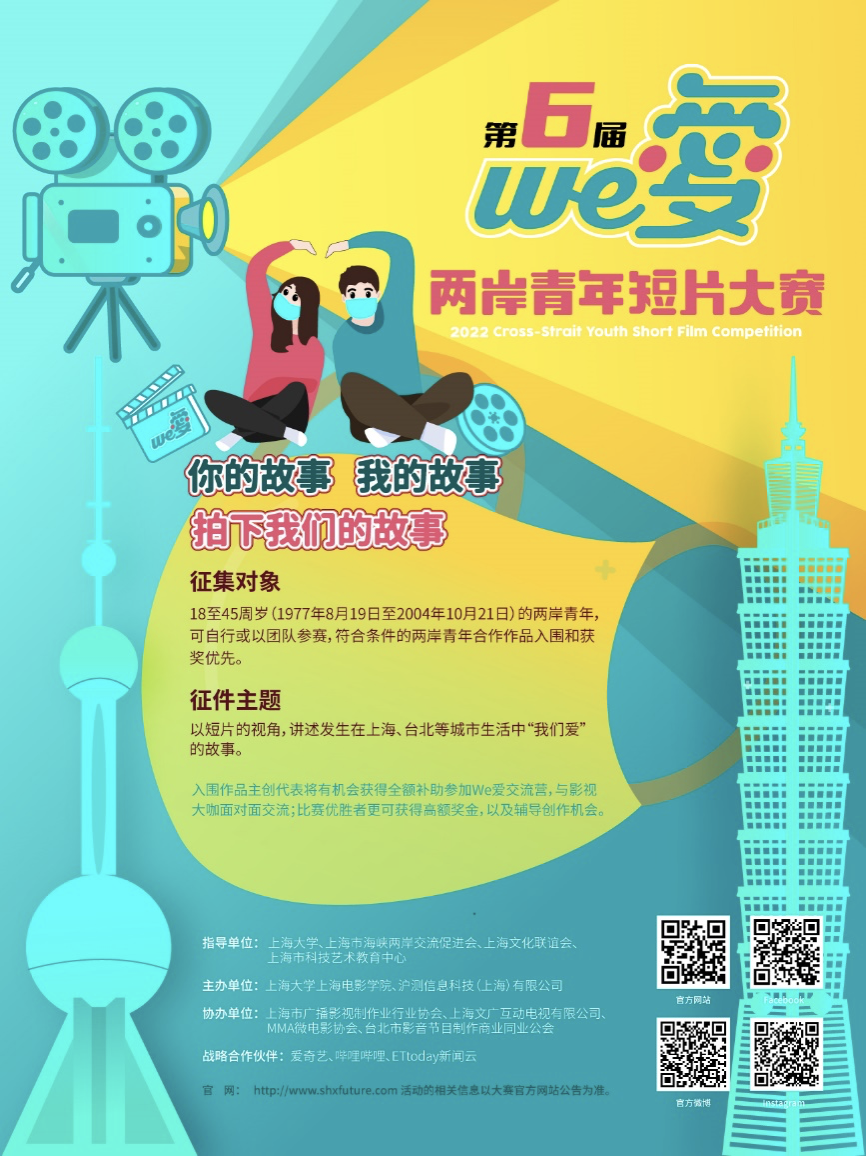 We爱·两岸青年短片大赛日前正式启动第六届,将于8月24日至10月21日面向两岸青年征集优秀作品,11月10日公布入围作品名单,12月上旬邀请两岸入围作品主创团队到上海和台北两地进行线上线下We爱交流营活动。