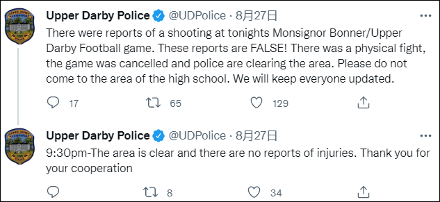 上达比警察局当晚9:00左右发推通报称,“有报道称今晚的邦纳主教高中和上达比高中的橄榄球赛上发生了枪击事件,这些报道都是假的。”警方表示,比赛现场发生了一起肢体冲突,比赛随后被取消。警方正在清理现场。
