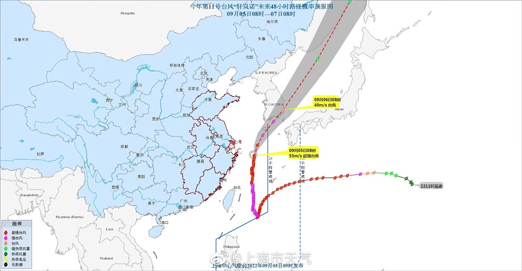 东方网记者包永婷9月5日报道:今年第11号台风“轩岚诺”(超强台风级)的中心今天(5日)08时位于距离上海浦东南汇嘴东南方向约306公里的海面上,就是北纬29.8度、东经124.9度,中心附近最大风力有16级(55米/秒),中心最低气压为930百帕,七级风圈半径350~400公里。 预计,“轩岚诺”将以每小时25~30公里的速度向北偏东方向移动,强度将逐渐减弱,今天14时前后越过人民广场同纬度,最近距离上海海岸线约300公里,之后向东北方向移动,逐渐远离上海,6日早晨到上午登陆或擦过韩国南部沿海。
