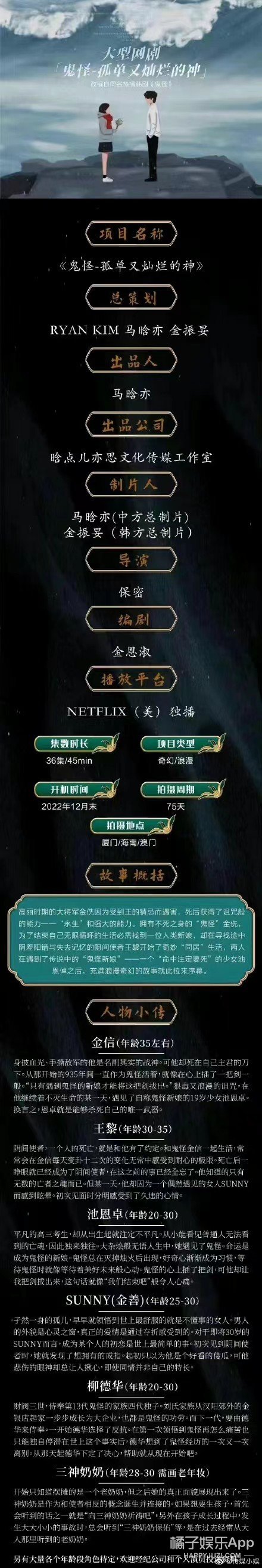 由金恩淑担任编剧(韩国著名编剧作家,《继承者》、《太阳的后裔》、《鬼怪》的编剧),预计12月末开拍,拍摄周期75天,共36集,将在网飞播出。