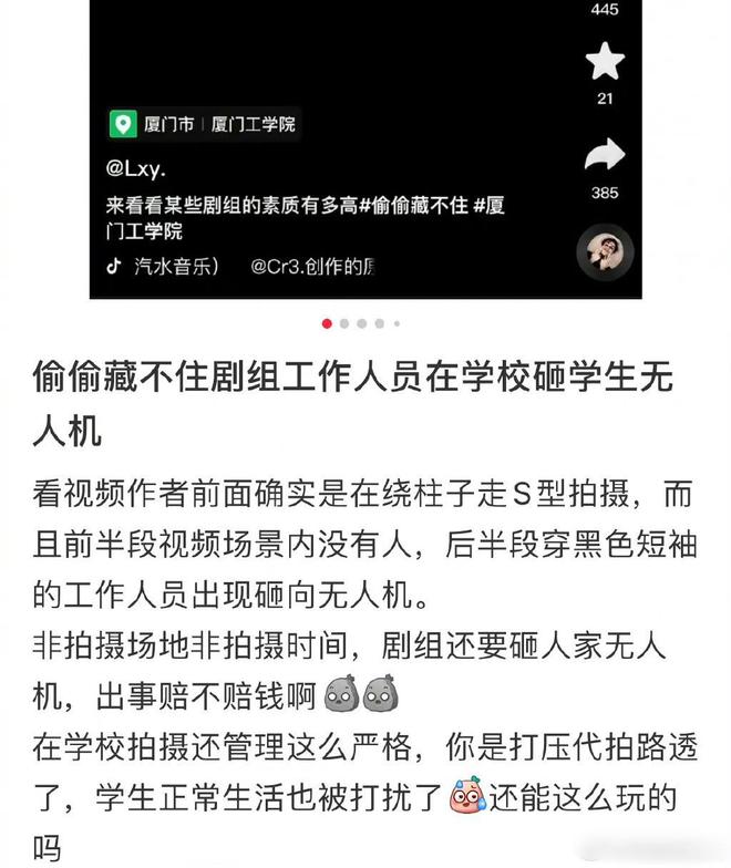 据悉,近日,有网友爆料说赵露思、陈哲远主演《偷偷藏不住》剧组工作人员砸学生无人机,网友表示自己只是在拍学校,而且这栋楼不是拍摄场地,这个位置拍不到那些地方。文中还指出,剧组拍摄干扰学生正常生活。
