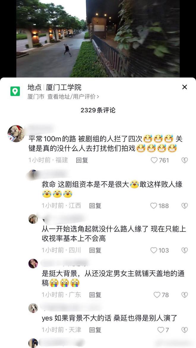 另外有其他人吐槽说:“真的下头死了,我被拦了好几次,回宿舍被拦在那里不让走”,“100米的路被拦了好几次,关键也没人打扰他们拍戏”。