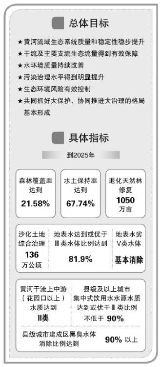 《行动方案》以维护黄河生态安全为目标,以改善生态环境质量为核心,明确了到2025年黄河流域森林覆盖率、水土保持率、退化天然林修复面积、沙化土地综合治理面积、地表水达到或优于Ⅲ类水体比例、地表水劣Ⅴ类水体比例、黄河干流上中游(花园口以上)水质、县级及以上城市集中式饮用水水源水质达到或优于Ⅲ类比例、县级城市建成区黑臭水体消除比例等目标要求。