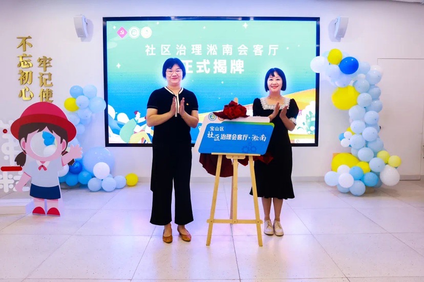 (淞南镇党委副书记陈文娟(左)、区党建服务中心主任周璟为宝山区社区治理淞南会客厅揭牌)