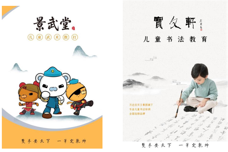 万达宝贝王集团一直是国内儿童行业的领军企业,本次新推出的景武堂、宝文轩两个文体品牌,是宝贝王布局儿童文体赛道推出的全新品牌。“双拳安天下、一笔定乾坤”的品牌口号,很好地诠释了两个品牌的品牌理念:景武堂以健体防身为目的,让孩子通过武术培训强身健体的同时,更培养孩子的勇毅品格与家国情怀;宝文轩以书法技能与文化素养双修为目标,让孩子从书法爱上文化艺术,并获得一个终生受益的特长。
