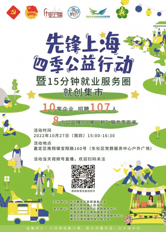 一、活动主题:先锋上海·四季公益行动暨“15分钟就业服务圈”就创集市