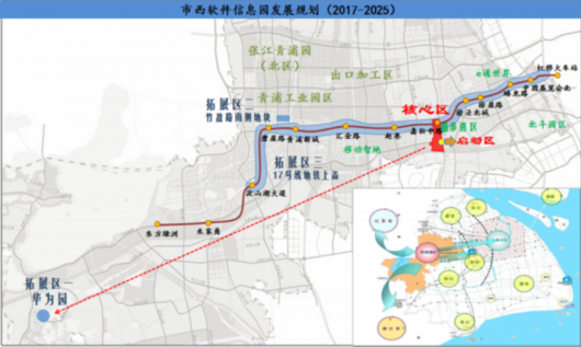 市西软件信息园坐落青浦区赵巷镇,位于虹桥国际中央商务区,距离上海虹桥枢纽约12公里。园区南临G50高速出入口,北临崧泽高架,轨交17号线嘉松中路位于园区内。园区总体规划分为三个区域:核心区、渗透区、拓展区。拓展区包括华为研发中心、17号线地铁上盖物业面积(80.4万方)。渗透区规划面积约2.25平方公里(3375亩)。核心区规划面积约1.5平方公里(2250亩),可建面积约140万平方米,形成“一带三轴三心三片”的空间结构,其中北区约900亩,已开发完成;中区约600亩,待开发;南区约750亩,已开发230亩,待开发520亩。
