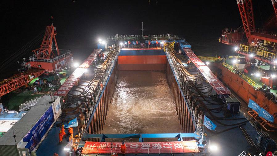 由22根巨型弧形梁组成的长48米、宽19米、高9米、重约8800吨的半圆柱体沉箱,将古船包裹起来,通过打捞工程船“奋力轮”月池壁上的46根提升器组成的液压同步提升系统进行起浮打捞。目前,打捞正在进行中。