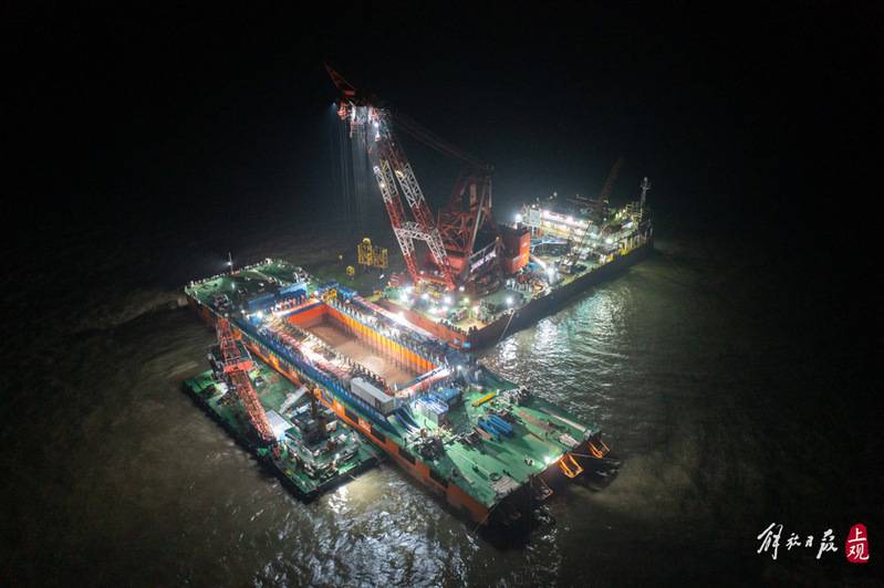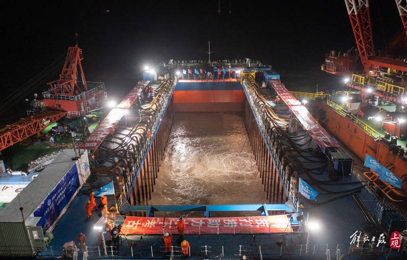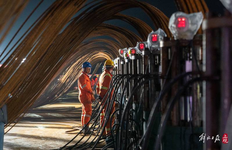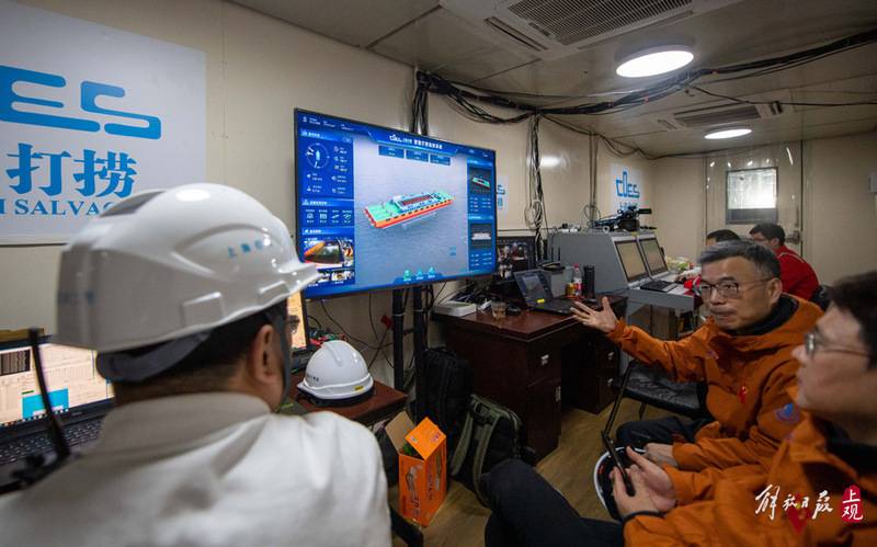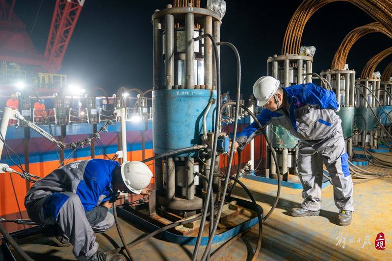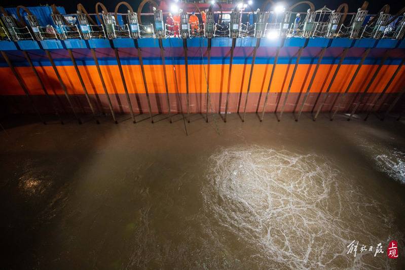 11月20日晚上7点,工作人员检查长江二号沉船液压同步提升系统。该系统由46个提升器组成,单个提升能力350吨,整体提升能力16100吨。