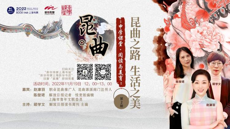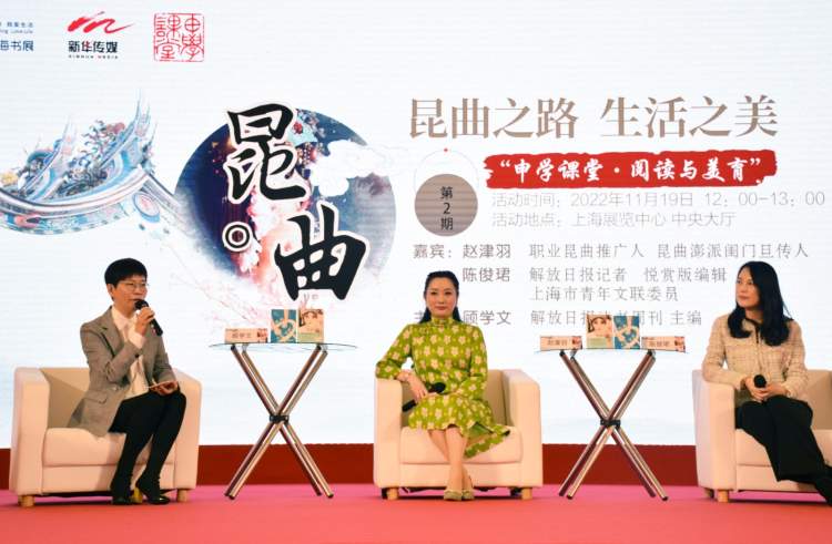 在2022上海书展中央大厅举办的“申学课堂·阅读与美育”第2期 昆曲之路,生活之美活动,邀请职业昆曲推广人、昆曲澎派闺门旦传人赵津羽、解放日报记者、悦赏版编辑、上海市青年文联委员陈俊珺与解放日报读书周刊主编顾学文一起,探讨如何将传统文化之美融入当代生活,倡导一种链接过去、启迪当下的艺术生活理念。
