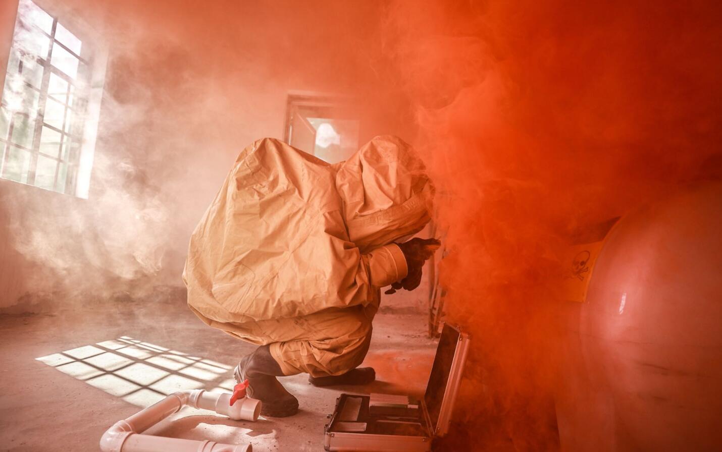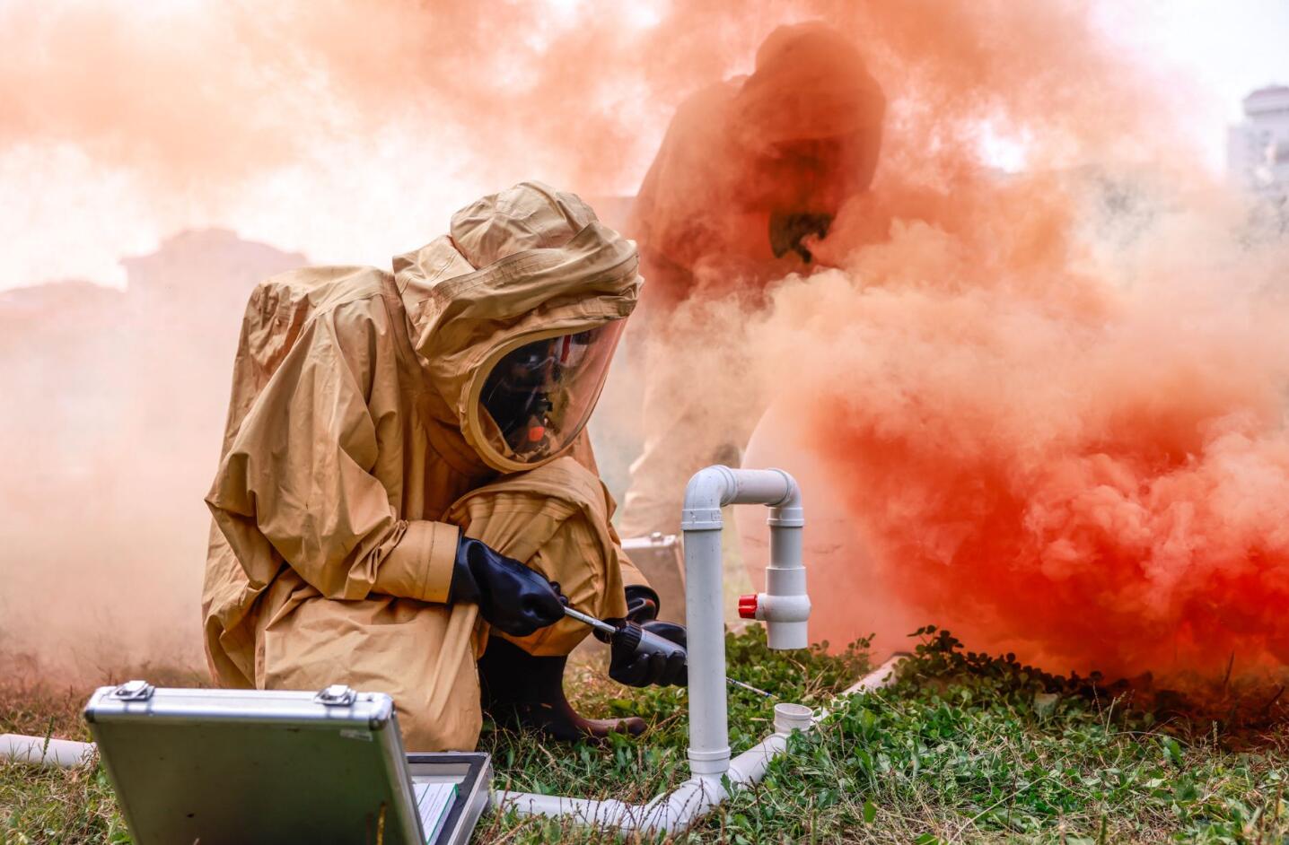 防化分队侦检组穿戴新式重型防护服进入泄露沾染区