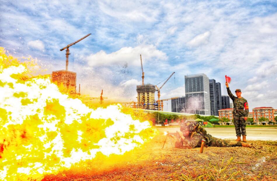 随着救援演练争分夺秒进行“生命大救援”的同时,防化分队喷火班的喷火器射击也在相应区域展开,一条条粗壮的火龙笔直命中目标,现场火光四溅瞬间将演练热度拉至最高。