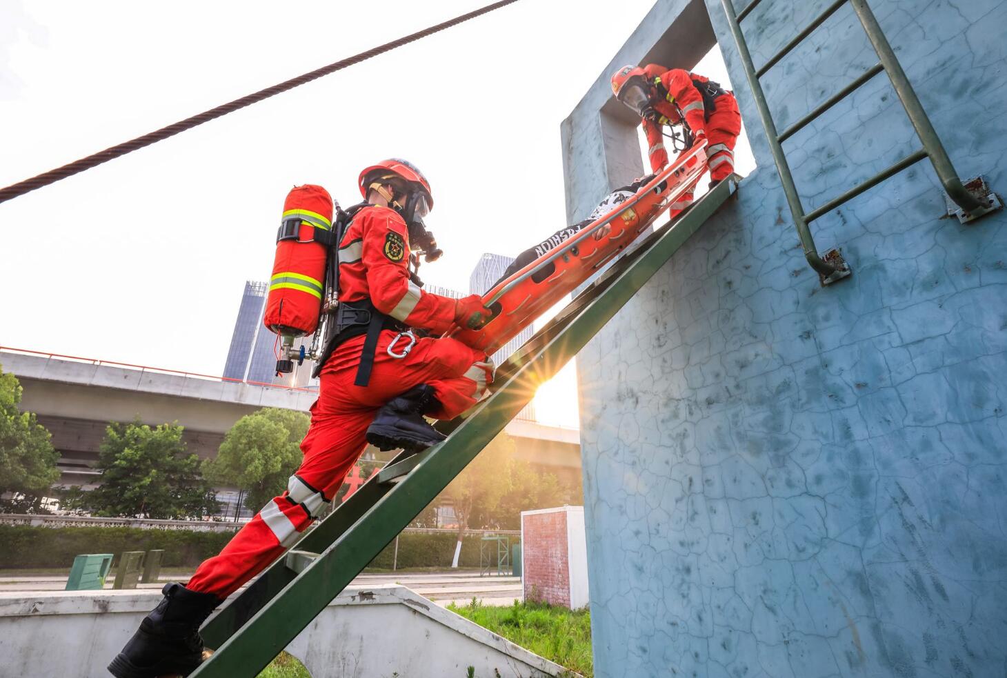 救援队员利用水平拉梯救援法将高出伤员进行转运